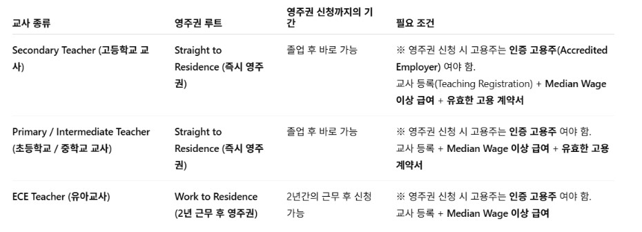 Graduate Diploma in Teaching을 수료하고, Teaching Council of Aotearoa New Zealand 에 교사 등록을 마친 뒤, 초등학교(Primary)・중학교(Intermediate)・고등학교(Secondary)・유아교육(ECE) 중 하나의 분야에서 근무하게 되면, 다음과 같은 영주권 루트가 제공됩니다.