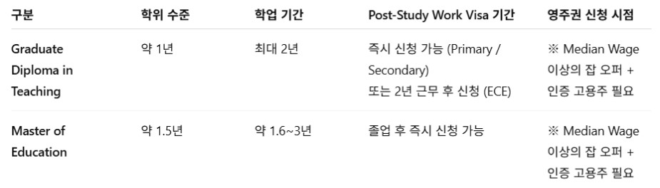 따라서 Graduate Diploma in Teaching 과정을 수료하고 교사로 근무하는 것은, 안정적이고 빠른 영주권 취득 루트로 평가됩니다.